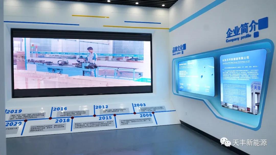 天豐新能源企業文化展廳,以 色彩”與“科技”為核心理念,展示著天豐產品的過硬資質,安裝時的精雕細琢,可謂一步一“景”,一景一“藝”,處處體現天豐新能源的匠心出品與精湛工藝,科技感與現代感融合,正是天豐新能源帶給客戶的佳體驗。